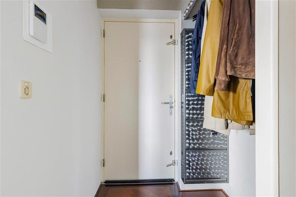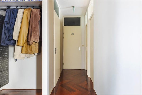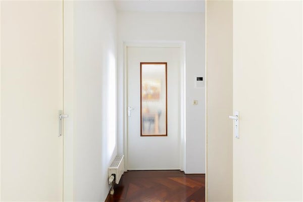 Via de verzorgde centrale entree met lift bereik je de zevende verdieping. De ruime verdiepingshal wordt slechts met één ander appartement gedeeld en biedt bovendien plaats aan twee extra opbergkasten.