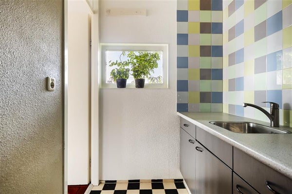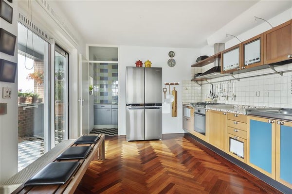 Aangrenzend bevindt zich de bijkeuken met een tweede keukenblok en spoelbak, aansluiting voor wasmachine, de stadsverwarmingsunit, groepenkast en ventilatie-unit die in 2025 is vervangen. Zowel de bijkeuken als het balkon zijn afgewerkt met Italiaanse marmeren tegels.