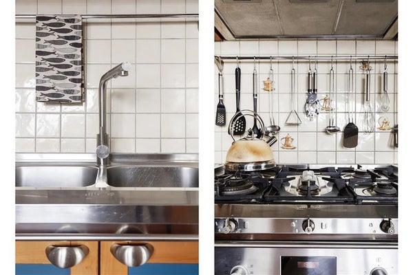 De open keuken is uitgerust met een French door koelkast van Whirlpool (uit 2025), een Bosch heteluchtoven uit 2025, een 5-pits gasfornuis van Smeg, een dubbele spoelbak van Smeg en een afzuigkap die is aangesloten op de mechanische ventilatie.