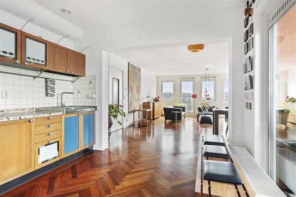 The well-maintained central entrance with elevator takes you to the seventh floor. The spacious hallway is shared with only one other apartment and also offers space for two additional storage cupboards.