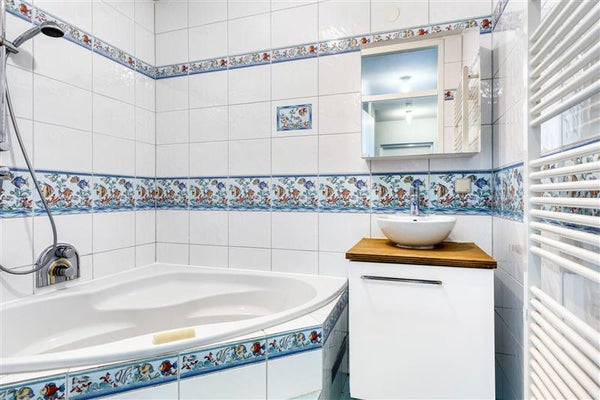The bathroom is equipped with a bathtub with shower and sink. The separate toilet has recently been fitted with a solid surface washbasin, which gives it an extra neat look.