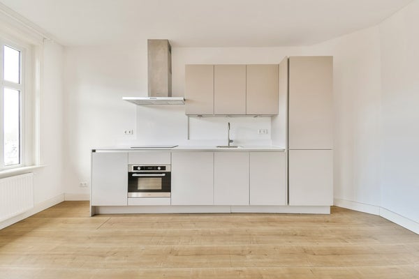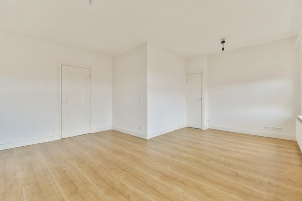 De vloer is voorzien van licht laminaat. De wanden en plafonds zijn strak wit afgewerkt, waardoor de ruimte een moderne uitstraling heeft.
