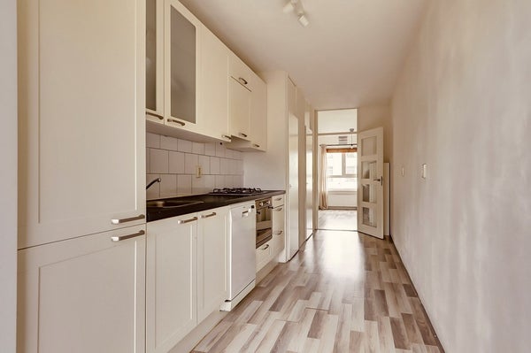 Aansluitend aan de woonkamer ligt de moderne keuken, die is voorzien van diverse inbouwapparatuur, waaronder een koel-/vriescombinatie, combi-oven/magnetron, vaatwasser en kookplaat. Vanuit de keuken heb je toegang tot het zonnige balkon op het zuidwesten. Daarnaast beschikt de keuken over een praktische inpandige berging, waar zich ook de CV-ketel en wasmachine-aansluiting bevinden.
