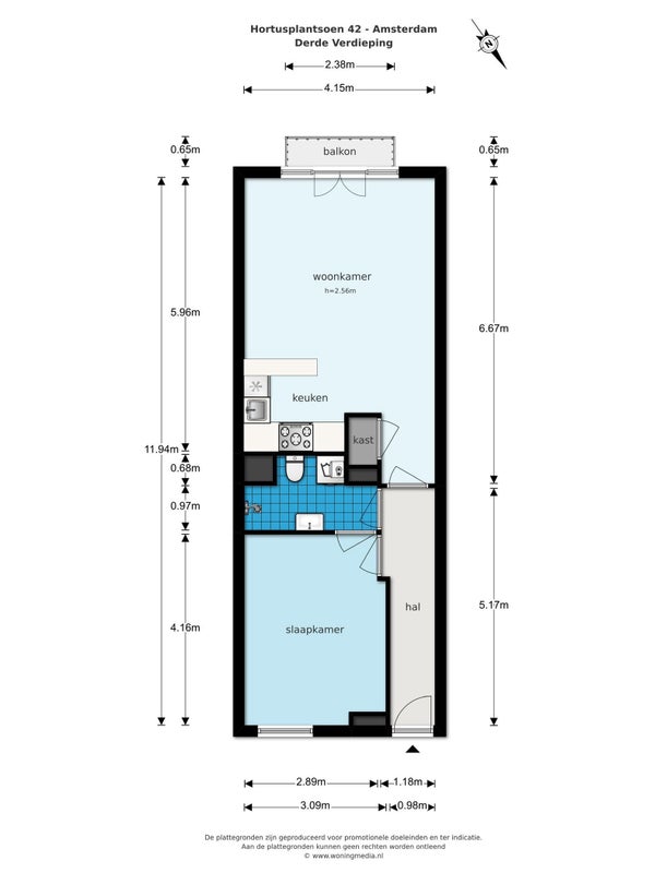 Indeling: de woning bestaat uit twee kamers waarvan één slaapkamer. Daarnaast is er een badkamer.