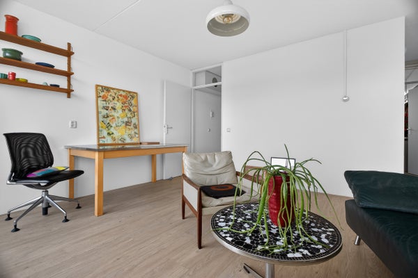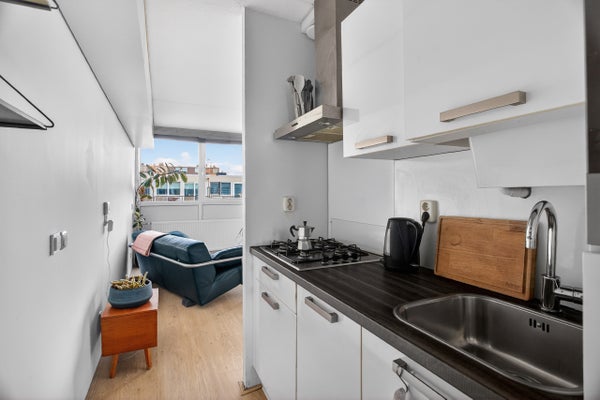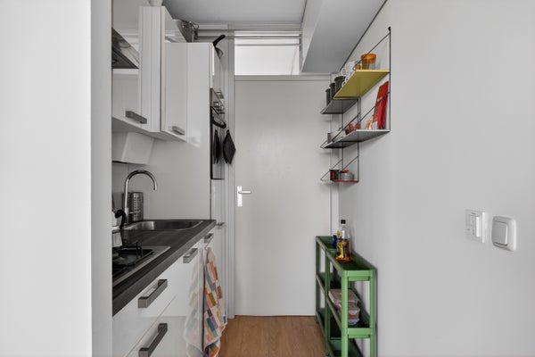 De ruime slaapkamer en de centrale badkamer met inloopdouche bevinden zich centraal in de woning. De woonkamer met halfopen keuken is de hart van het appartement en biedt toegang tot het balkon van 7 m². Het appartement is voorzien van een nette laminaatvloer, en op de begane grond is er een berging voor opslag of stalling van fietsen.
