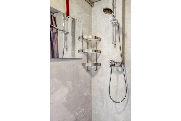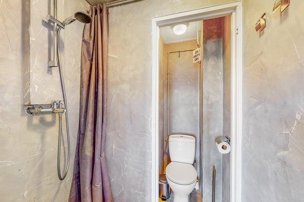 De badkamer is netjes en functioneel en beschikt over een douche en toilet.