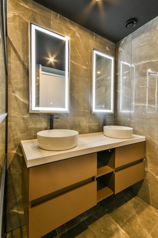 De badkamer is netjes en betegeld. De ruimte is uitgerust met een wastafelmeubel met spiegel, een regendouche en een radiator. De woning wordt verwarmd middels stadsverwarming.