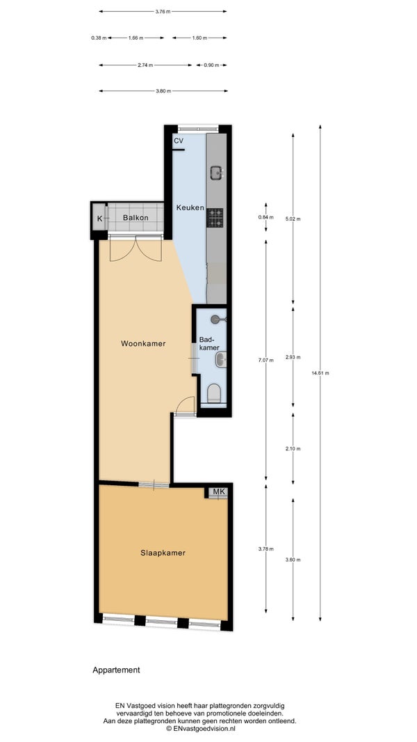 Entree, lichte woonkamer met drie grote ramen aan de voorzijde, keuken, slaapkamer, badkamer en toegang tot het balkon aan de achterzijde.