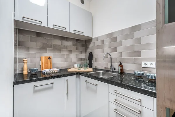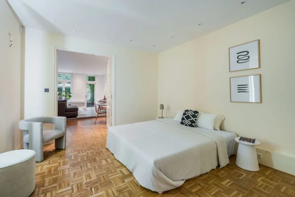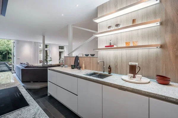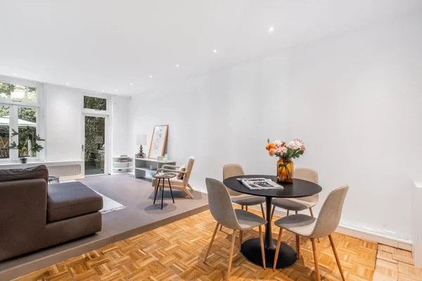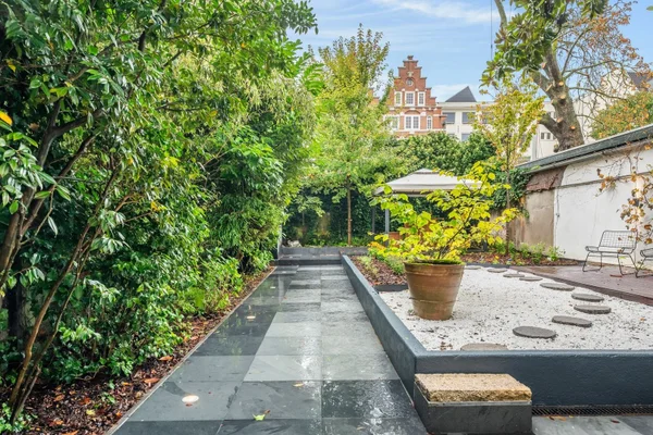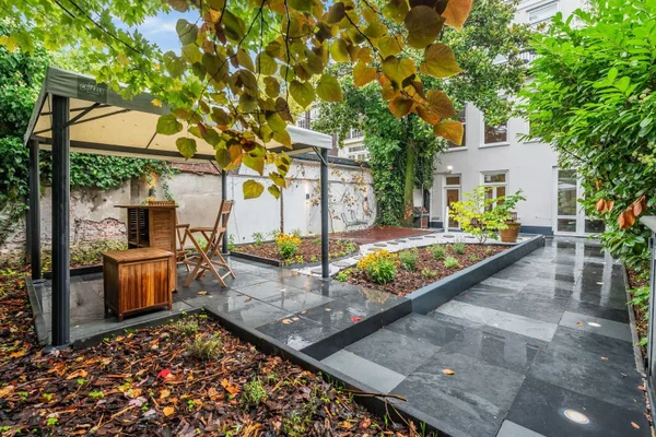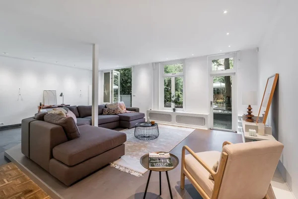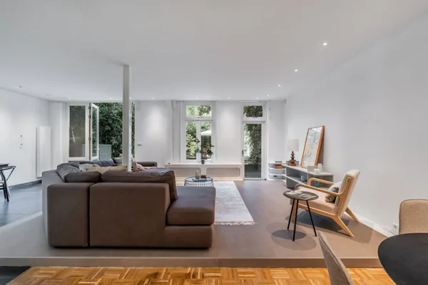 De begane grond heeft een ruime woonkamer met open keuken en toegang tot de tuin. De moderne keuken is van alle gemakken voorzien. De slaapkamer heeft een walk-in-closet en een badkamer met douche en Turks stoombad. De bel-etage, ooit kantoor, biedt ruimte voor meerdere slaapkamers en heeft voorzieningen zoals een badkamer en pantry. Het appartement is deels voorzien van vloerverwarming en energielabel B.