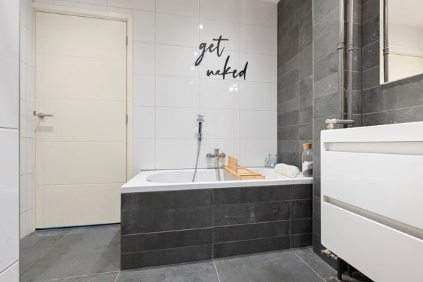 De badkamer is modern uitgevoerd en voorzien van een ligbad, douche en wastafel. Het toilet bevindt zich separaat.