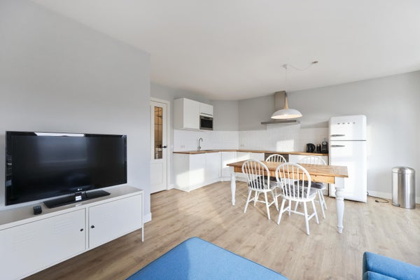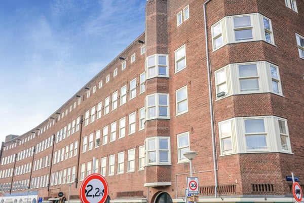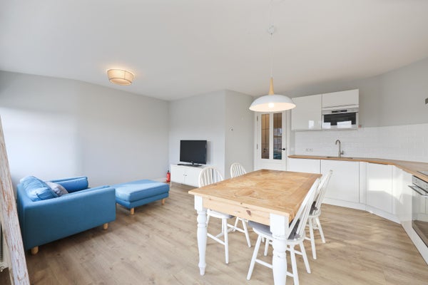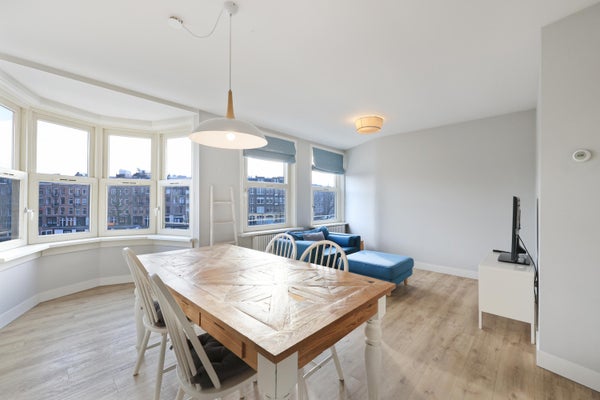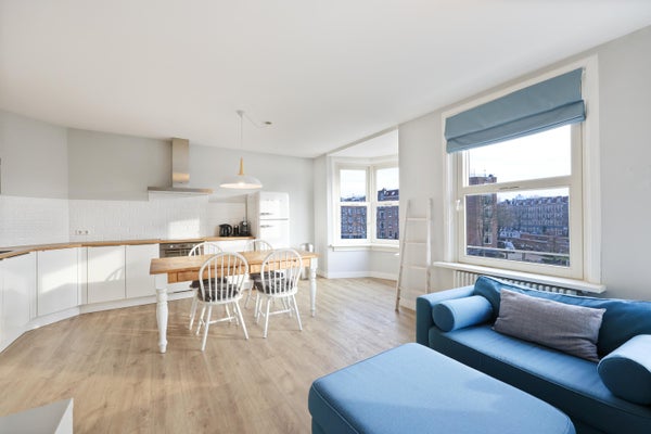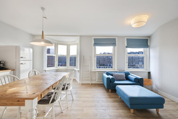 The living room with open-plan kitchen is wonderfully bright thanks to the large windows spanning the entire width of the room. The alcove at the front creates a wonderful sense of space and offers a beautiful view of the canals and Amsterdam.