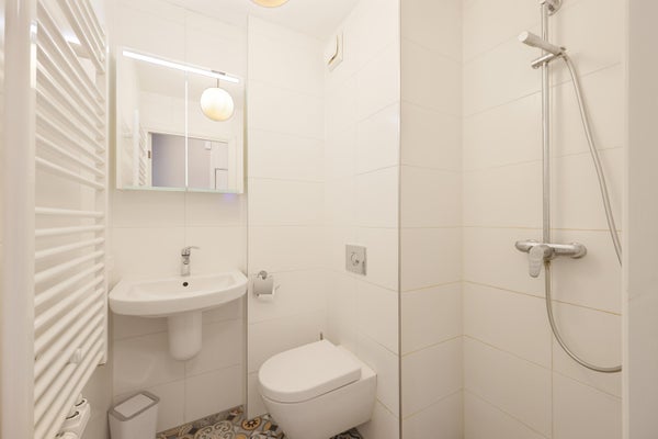 Nette badkamer met inloopdouche, wasbak en ingebouwd toilet.