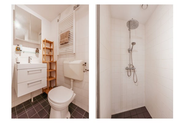 Through the central hallway, you reach the bathroom, which is fitted with a toilet, washbasin, and shower.