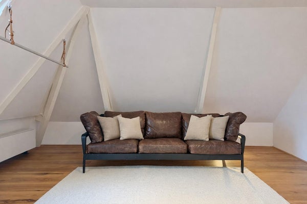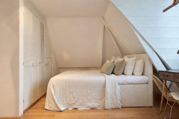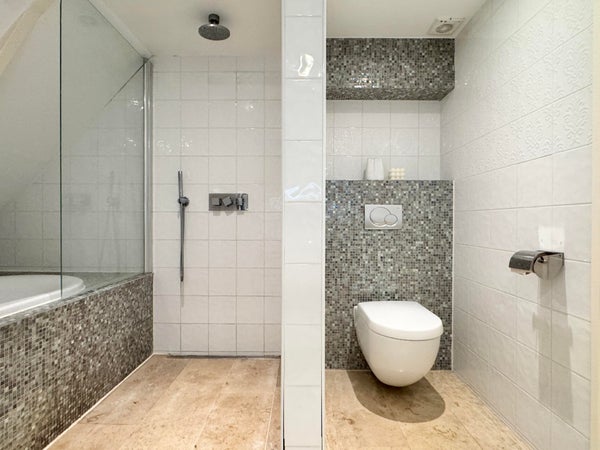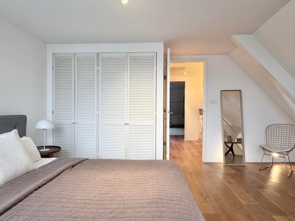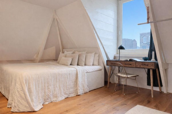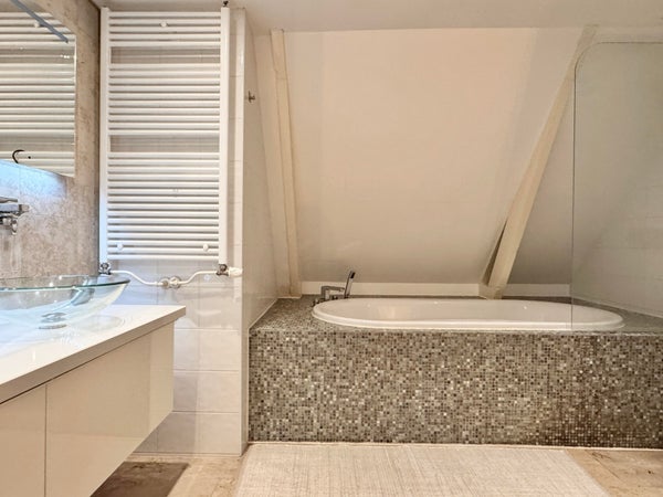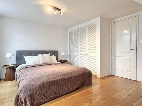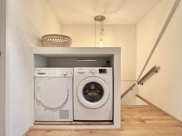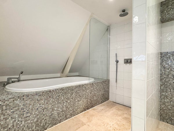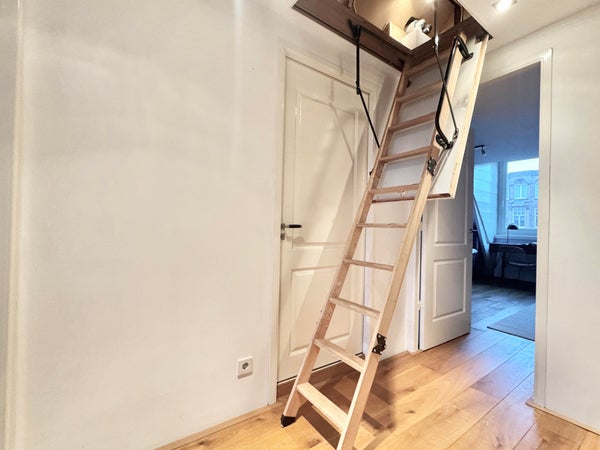 Op de derde verdieping vindt u twee goed bemeten slaapkamers en een comfortabele badkamer, voorzien van een ligbad, aparte douche, wastafel en toilet. In de gang is een ingebouwde berging met aansluitingen voor wasmachine en droger, wat de indeling praktisch en efficiënt maakt. Daarnaast beschikt het appartement over een praktische zolder met een hoogte van bijna 1,50 meter en een lengte van 8 meter, ideaal voor het opbergen van bijvoorbeeld winterkleding, koffers en andere spullen.