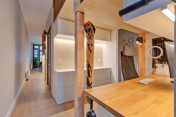 Via de eetkamer bereikt u het rustig gelegen slaapgedeelte. Hier bevinden zich twee sfeervolle en speels ingedeelde slaapruimtes met een slim split-level ontwerp. De verhoogde slaapplaatsen zijn bereikbaar via een charmant trappetje en geven de ruimtes een knus en uniek karakter. Onder de ene slaapruimte is extra bergruimte gerealiseerd, terwijl onder de andere een praktische en rustige werkplek is ingericht. Grenzend aan een van de slaapruimtes, aan de voorzijde van de woning, bevindt zich tevens nog een extra lichte ruimte direct aan het raam. Deze kamer kan gebruikt worden als speelruimte, rustige zithoek of extra werkplek, een flexibele plek die zich makkelijk aanpast. Hoewel deze ruimtes geen traditioneel afgesloten slaapkamers zijn, zijn ze functioneel, creatief en efficiënt benut. Indien gewenst kan de huidige indeling eenvoudig worden aangepast. Zo kan de ene huidige slaap/opbergruimte worden verwijderd en de andere slaap/werkplek aan de voorzijde van de woning worden omgebouwd tot een reguliere slaapkamer.