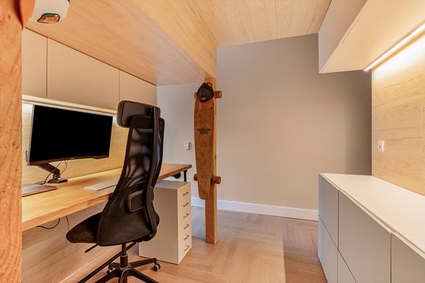 From the dining area, you access the charming sleeping quarters, which comprise two creatively designed bedrooms with a smart split-level layout. The elevated sleeping areas are reached via a little staircase, giving the rooms a cozy and distinctive character. Under one of the bedrooms, additional storage has been cleverly integrated, while under the other, a practical workspace has been created. Adjacent to this workspace is a bright, versatile room by the window, ideal as a play area, quiet reading corner, or additional workspace, a flexible space that adapts easily to your needs. Although these rooms are not traditional enclosed bedrooms, they are highly functional, creative, and efficiently utilized. If desired, the current layout can be easily adapted. The elevated bedroom can be removed, and the storage beneath along with the other raised work/sleep area at the front of the house can be converted into a regular bedroom, offering flexibility to suit future needs.