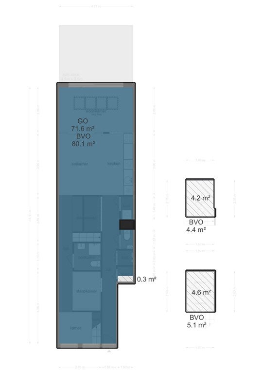 - De benedenwoning heeft een woonoppervlakte van 71 m² en beschikt over 3 kamers, waarvan 2 slaapkamers;
