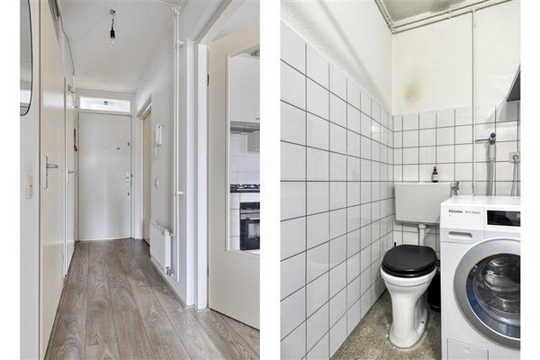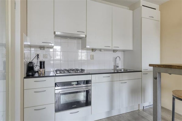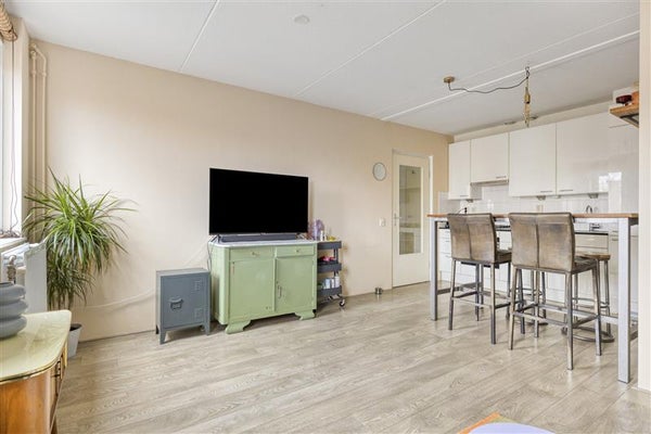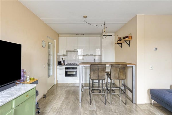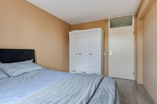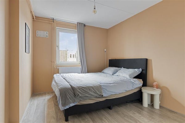 Via het trappenhuis bereik je de vierde verdieping. Via de hal heb je toegang tot alle ruimtes van de woning. De woonkamer met open keuken voelt door de grote ramen direct uitnodigend en licht aan. De keuken is voorzien van de nodige inbouwapparatuur en vormt samen met de woonkamer een prettige leefruimte. Daarnaast beschikt het appartement over een royale slaapkamer, een rustige plek om je terug te trekken. De badkamer is praktisch ingericht met een douche, toilet, wastafel en aansluiting voor de wasmachine.