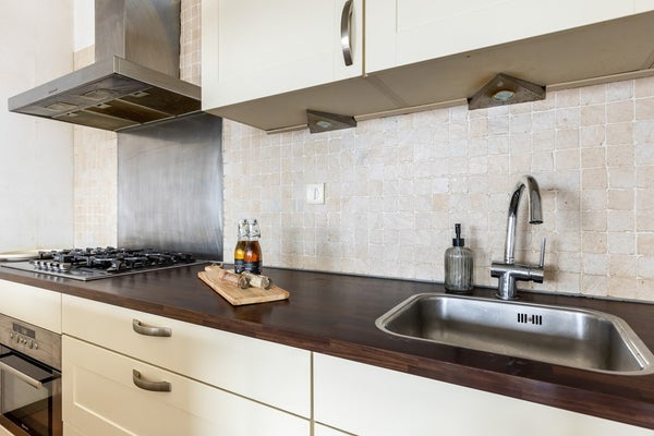 De woonkamer is licht en ruim en staat in open verbinding met de keuken. Via openslaande deuren is het balkon bereikbaar, gelegen op het zuidwesten en van een prettig formaat. De keuken is uitgerust met diverse inbouwapparatuur, waaronder een gasfornuis met afzuigkap, oven, vaatwasser en koel-vriescombinatie, en biedt veel kastruimte.