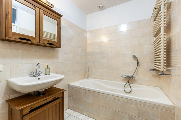 Entrance: a spacious hall with access to the utility room containing the central heating system, heat recovery system, and additional storage space. At the rear are two good-sized bedrooms, both with direct access to the balcony. The bathroom has a bathtub, separate shower and sink. The toilet is separate and equipped with a small sink.