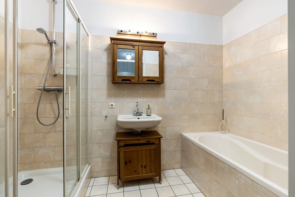 The bright and spacious living room is open plan to the kitchen. French doors open onto the southwest-facing balcony, which is a good size. The kitchen is equipped with various built-in appliances, including a gas stove with extractor hood, oven, dishwasher, and fridge-freezer, and offers ample cupboard space.