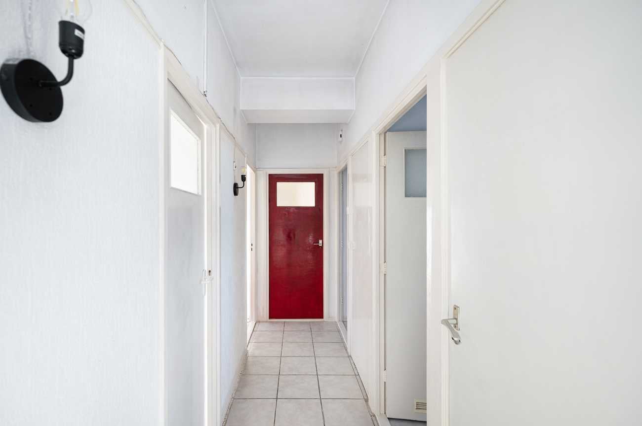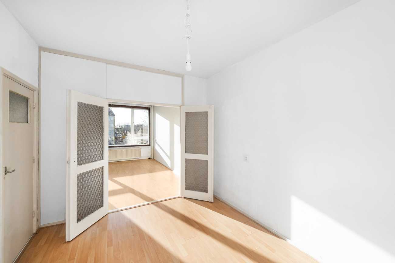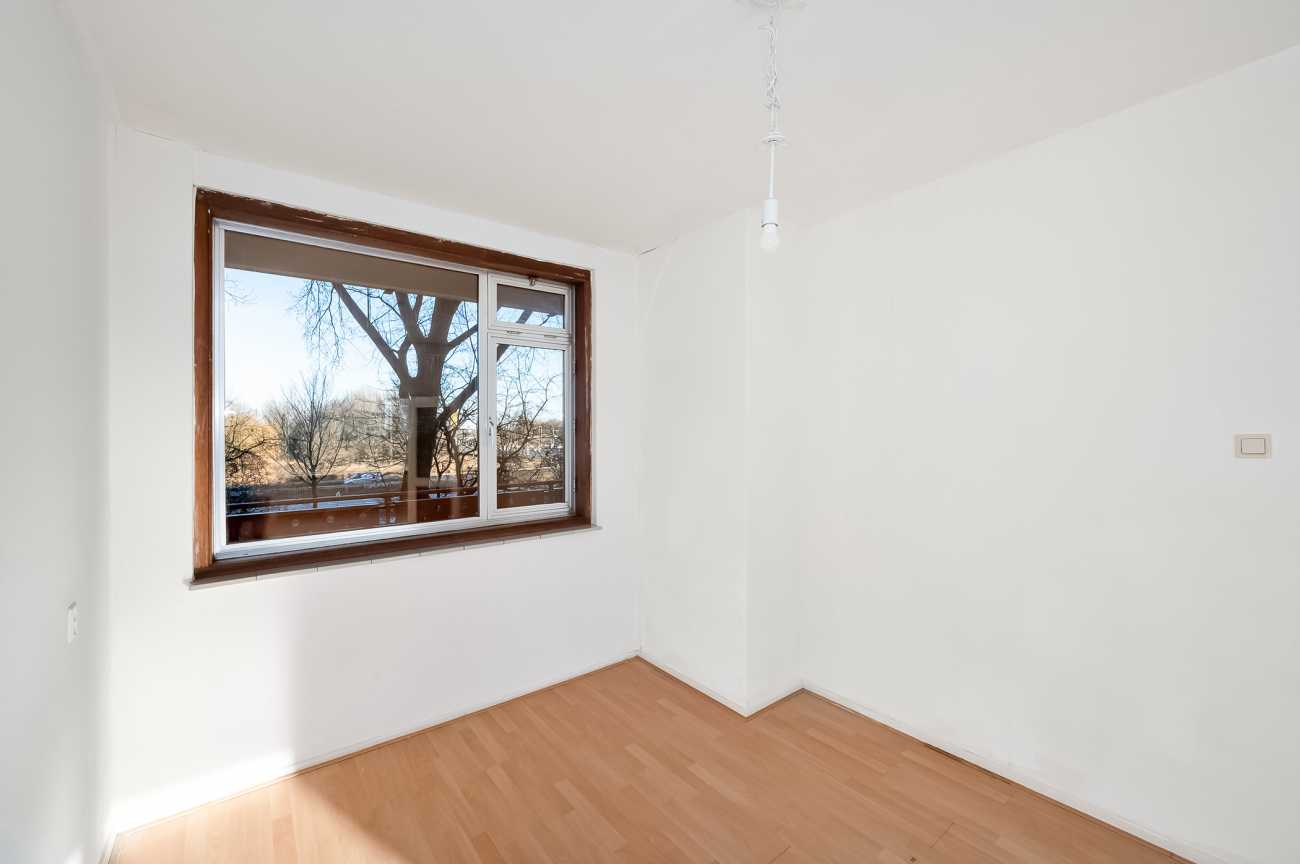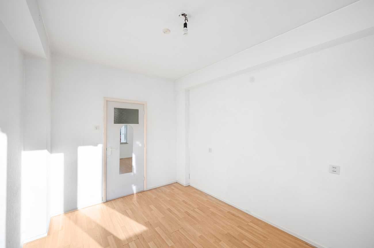 Het appartement op de tweede verdieping heeft twee ruime slaapkamers en een derde kamer die ideaal kan zijn als extra slaapkamer of kantoor. De badkamer is eenvoudig, en de keuken kan naar eigen wens worden ingericht. Met 78,10 m² woonoppervlakte en recente schilderwerk, is deze ruimte klaar voor modernisering. Erfpacht is eeuwigdurend afgekocht. De servicekosten bedragen 376 euro p.m. en het energielabel is D.