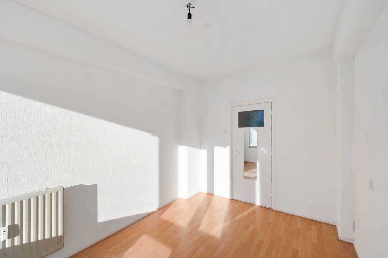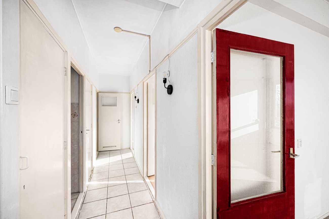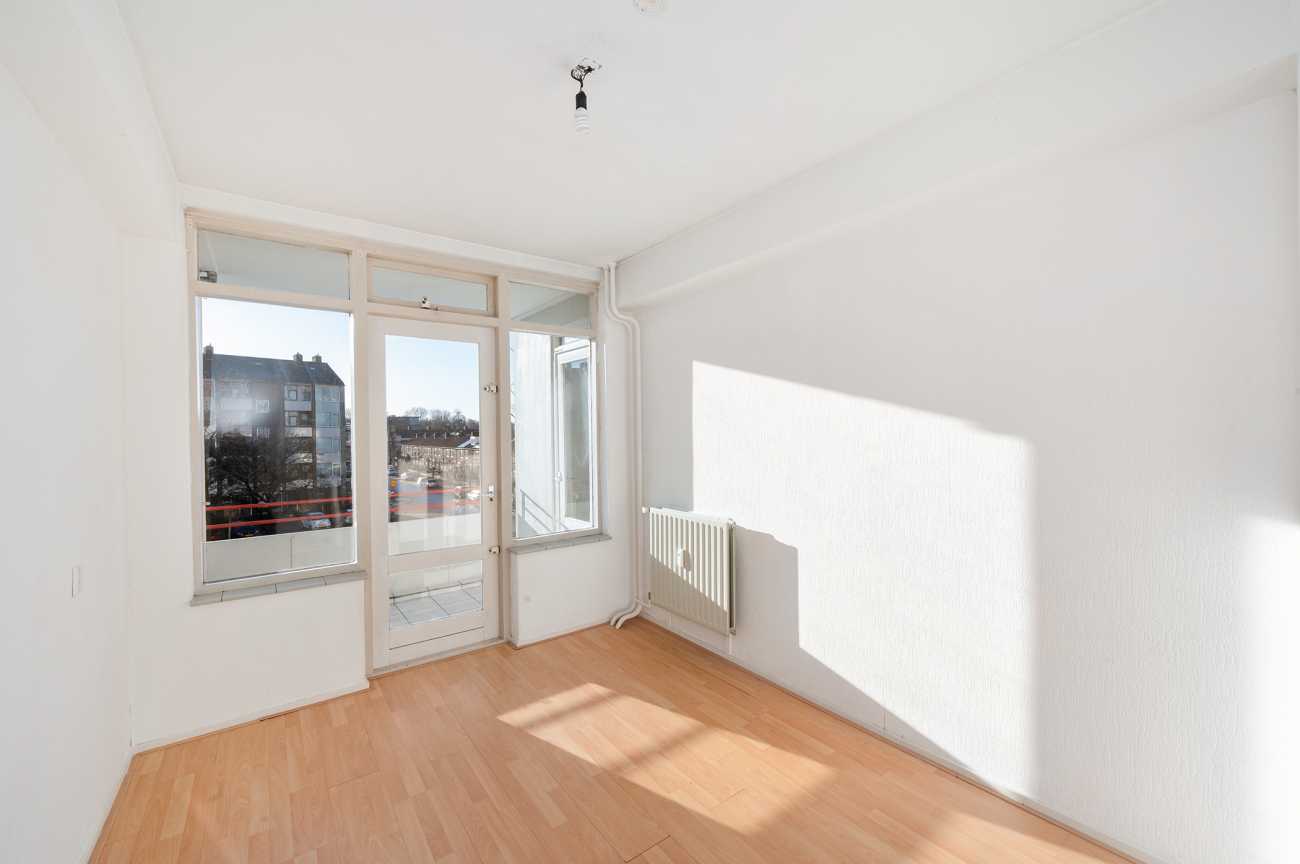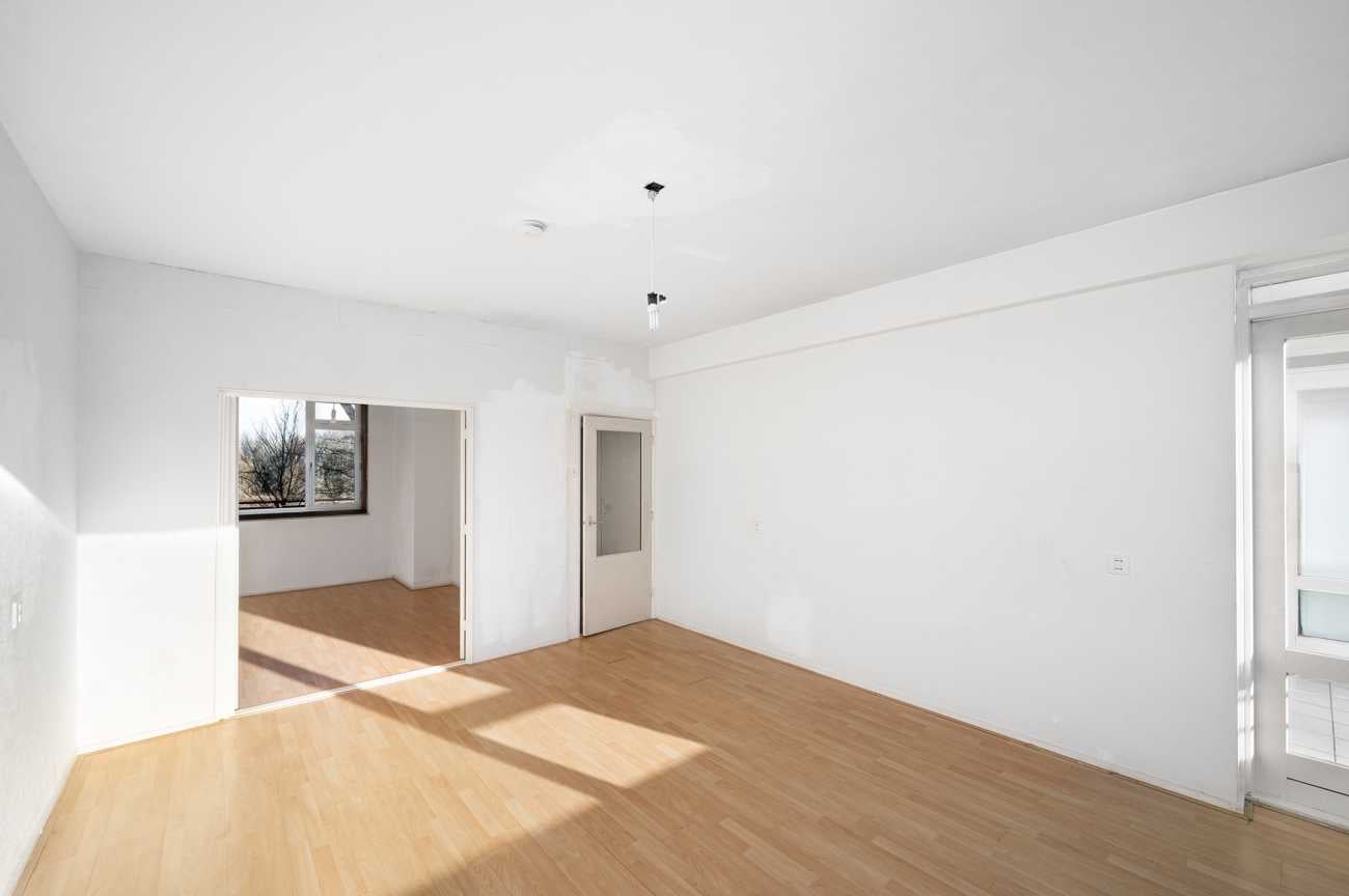 Het appartement op de tweede verdieping heeft twee ruime slaapkamers en een derde kamer die ideaal kan zijn als extra slaapkamer of kantoor. De badkamer is eenvoudig, en de keuken kan naar eigen wens worden ingericht. Met 78,10 m² woonoppervlakte en recente schilderwerk, is deze ruimte klaar voor modernisering. Erfpacht is eeuwigdurend afgekocht. De servicekosten bedragen 376 euro p.m. en het energielabel is D.