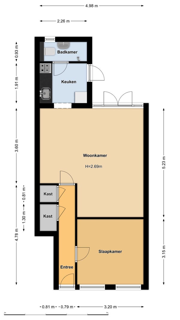 - De benedenwoning heeft een woonoppervlakte van 47 m² en beschikt over 2 kamers, waarvan 1 slaapkamer;