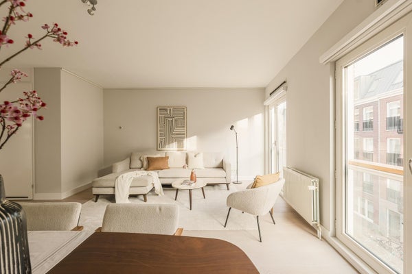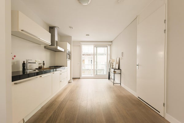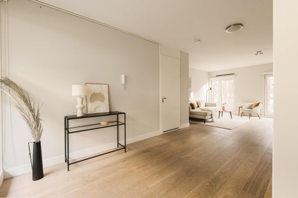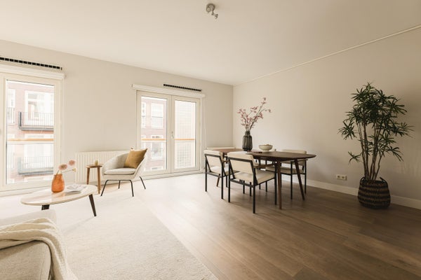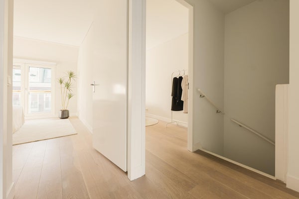 The spacious living room is situated at the rear of the apartment and features double French doors with views over the Tweede Sweelinckstraat. An internal staircase provides access to the: