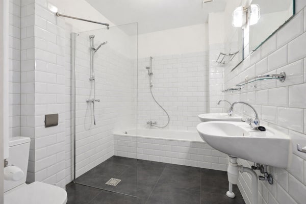 In het hart van de woning bevindt zich de badkamer, betegeld in neutraal wit en voorzien van dubbele wastafel, inloopdouche, ligbad en toilet.