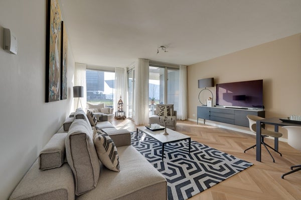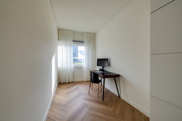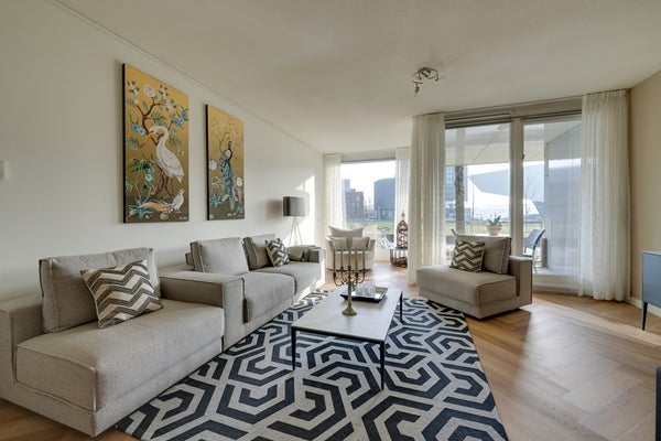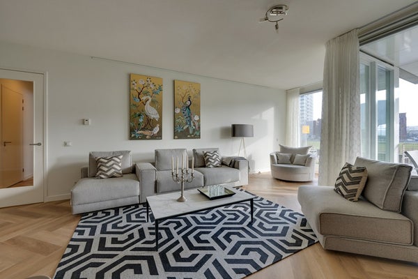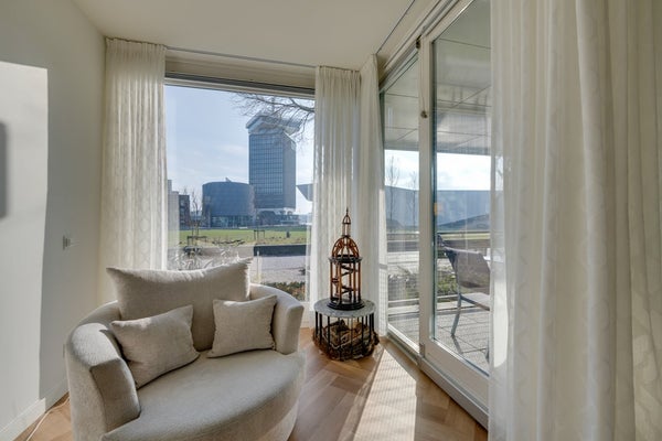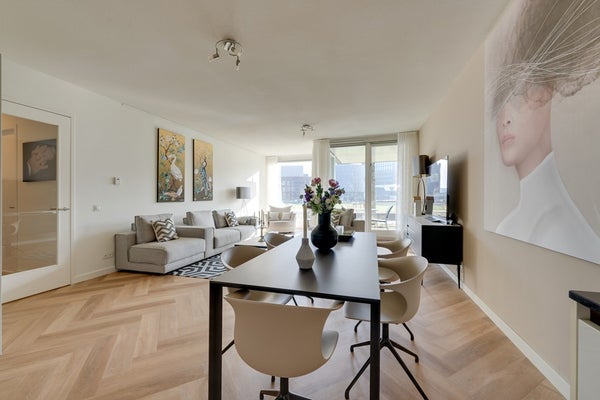 Bij binnenkomst ervaart u direct de royale opzet en de prettige sfeer van het appartement. De hal biedt toegang tot alle vertrekken en geeft een verzorgde eerste indruk. De lichte en ruime woonkamer vormt het hart van de woning en is dankzij de grote raampartijen bijzonder aangenaam. In 2025 is er een mooie pvc vloer gelegd en zijn de wanden voorzien van behang en schilderwerk. Het gehele appartement is voorzien van vloerverwarming, welke tevens koelt in de zomer. Er is volop ruimte voor een comfortabele zithoek en een grote eettafel, ideaal voor gezellige avonden met familie of vrienden. Vanuit de woonkamer heeft u directe toegang tot het terras, waardoor binnen en buiten op een natuurlijke manier met elkaar verbonden zijn en waar er een prachtig uitzicht op het IJ is.