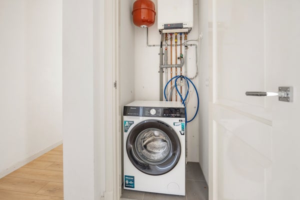 De luxe en royale badkamer beschikt over een ligbad, inloopdouche, dubbele wastafel, handdoekradiator en tijdloos tegelwerk tot het plafond. Daarnaast is er een separate toiletruimte met wandcloset en fontein. Via de hal is er ook nog toegang tot een aparte bergkast met aansluiting voor een wasmachine en de CV-installatie.