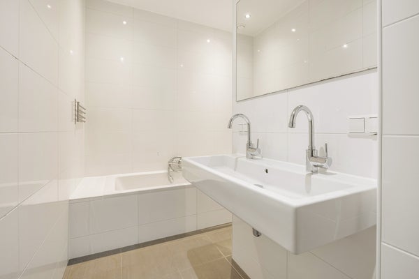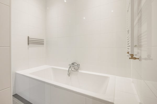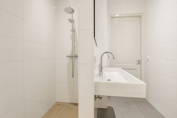 The luxurious and spacious bathroom features a bathtub, walk-in shower, double washbasin, towel radiator and timeless floor-to-ceiling tiling. There is also a separate toilet with wall-mounted closet and washbasin. From the hallway, there is access to a separate storage cupboard with washing machine connection and central heating installation.