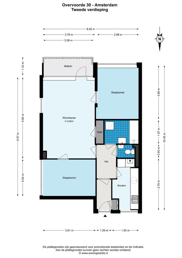 - De galerijflat heeft een woonoppervlakte van 66 m² en beschikt over 3 kamers, waarvan 2 slaapkamers;