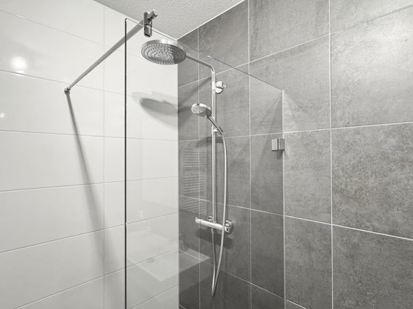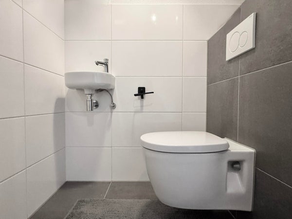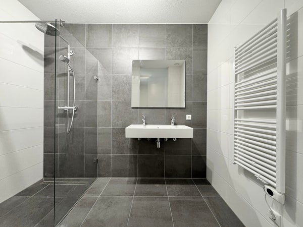 The living room with open kitchen and dining area is directly connected to a generous covered balcony of approximately 8 square metres, providing a comfortable extension of the living space. The bathroom is equipped with a double washbasin, walk-in shower (rainshower + handshower) and towel radiator, and the apartment also features a separate toilet. In addition, a spacious laundry and storage room of approximately 5 square metres, suitable for a washing machine and dryer, is integrated within the living space.