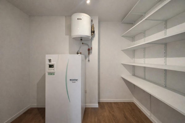 Het appartement beschikt over een uitzonderlijk ruime interne berging en wasruimte van circa 5 vierkante meter. In deze multifunctionele ruimte zijn de warmtepomp en het ventilatiesysteem geplaatst, terwijl er tegelijkertijd volop ruimte overblijft voor praktisch gebruik. Aansluitingen voor een wasmachine en droger zijn aanwezig en dankzij de uitgebreide stellingkasten is er meer dan voldoende opbergcapaciteit. De ruimte biedt daarnaast plaats voor het netjes opbergen van koffers, seizoensspullen en andere items die zich uitstekend lenen voor langdurige opslag, wat deze berging tot een zeer waardevolle en praktische toevoeging aan de woning maakt.