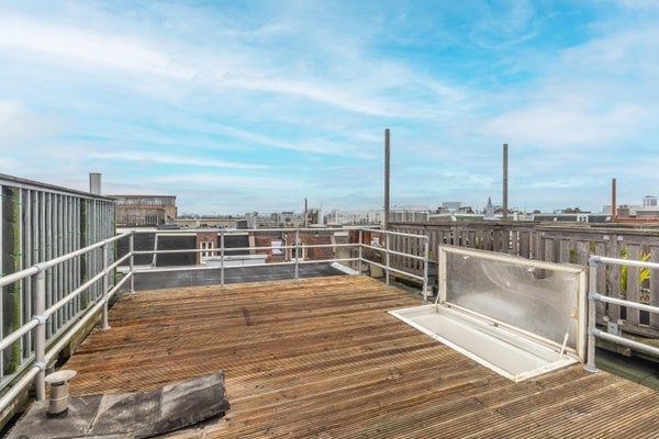 De woning beschikt over drie grote ramen aan de voorzijde, twee slaapkamers en een zonnig privé dakterras. Een uitzonderlijke combinatie van licht, ruimte en comfort — spullen pakken en verhuizen maar.
