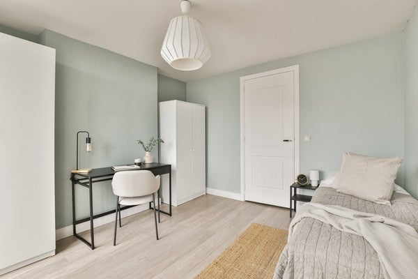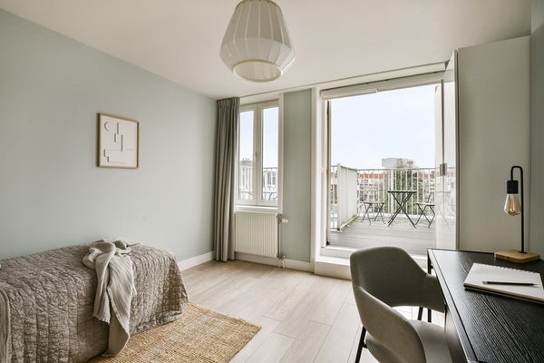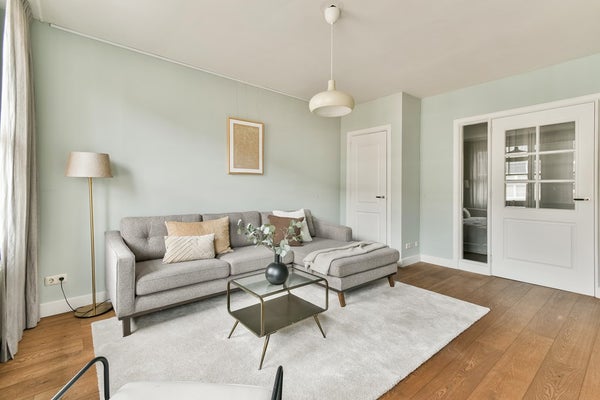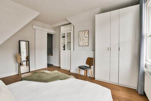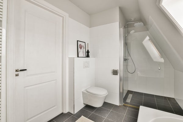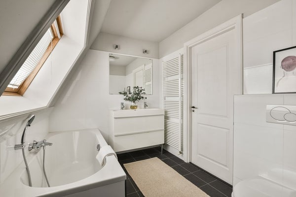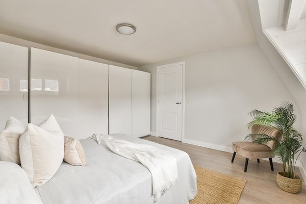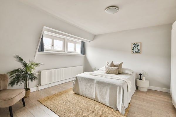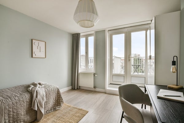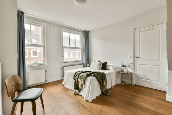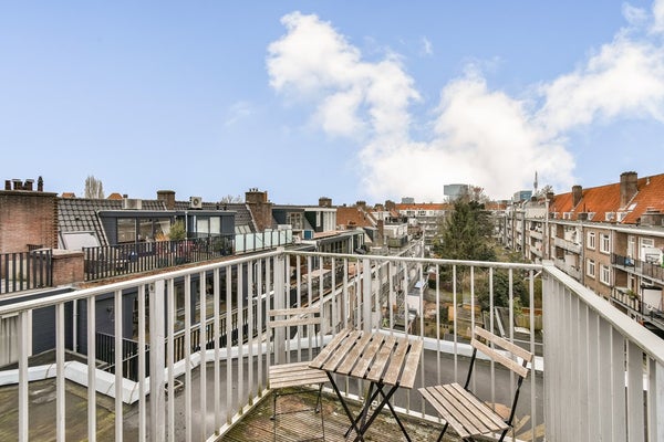 Upon entering via the communal staircase on the third floor, you step into the spacious hallway with access to the various rooms. At the front of the apartment is the living room overlooking Deurloostraat. Also at the front is the first bedroom with access to the bathroom, which is fitted with a walk-in shower, vanity unit, bathtub and designer radiator.