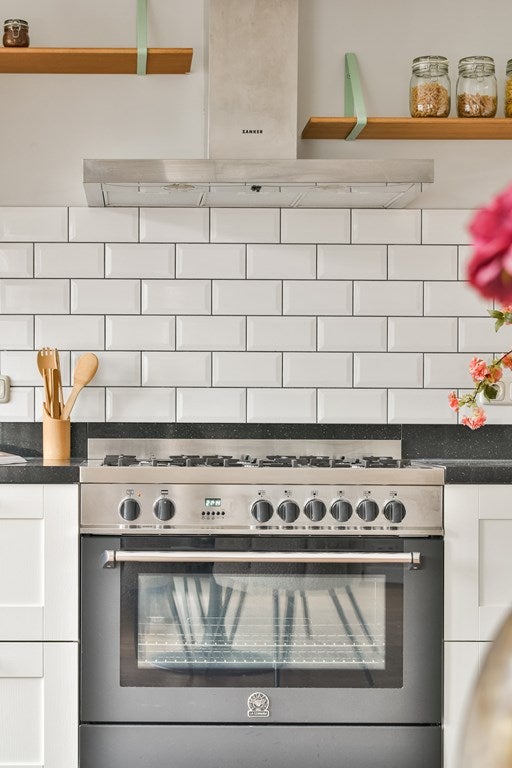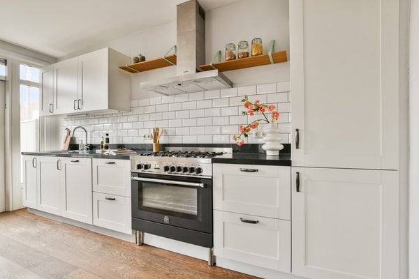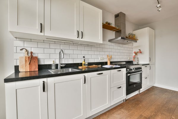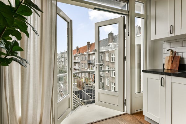 Aan de achterzijde van de woning is de open leefkeuken, die dienst doet als een tweede woonkamer. De open keuken is voorzien van diverse inbouwapparatuur, waaronder een ijskast en vriezer, een 6-pits gasfornuis met oven, een afwasmachine, een afzuigkap en voldoende kastruimte. Vanuit de keuken is het balkon aan de achterzijde bereikbaar dat pal op het zuiden is gelegen. Deze verdieping is volledig voorzien van een stijlvolle houten vloer en beschikt daarnaast over een separaat toilet.