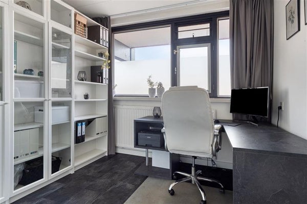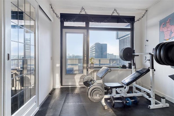 Vanuit de woonkamer loop je makkelijk door naar de extra kamer, die nu dienst doet als thuisfitnessruimte. Deze kamer biedt echter ook de mogelijkheid om een derde slaapkamer te realiseren of in te richten als werk- of hobbyruimte. Via deze kamer heb je directe toegang tot het woningbrede balkon met zijn fijne ligging op het zuidwesten. Hier kun je ongestoord van de zon genieten of even opladen in alle rust terwijl je over de stad of natuur uitkijkt.