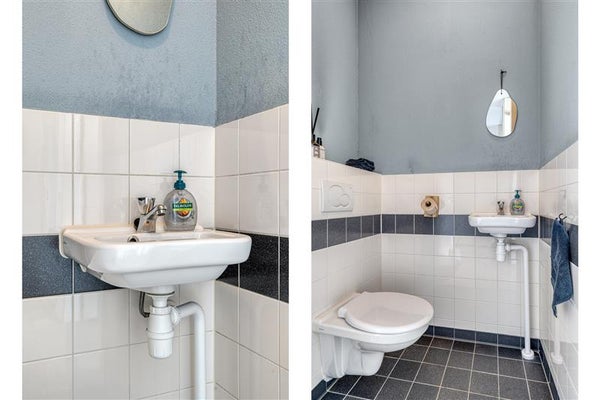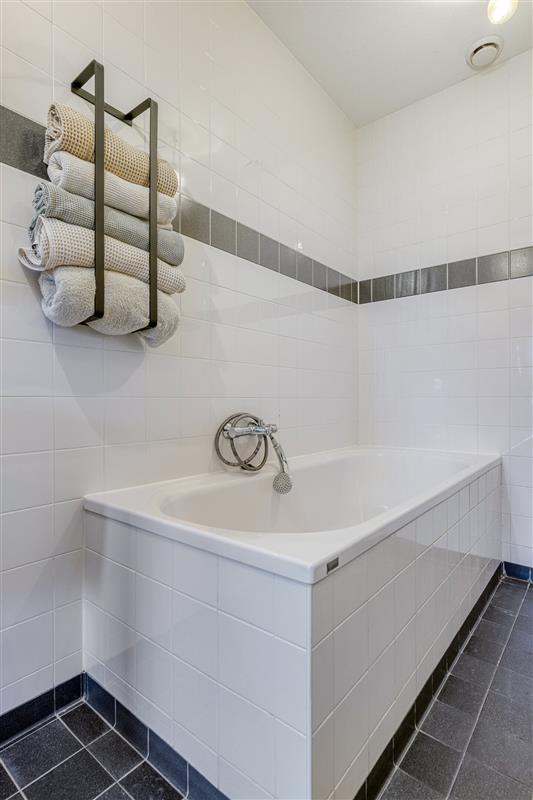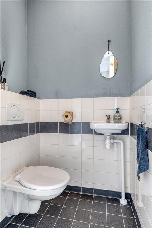 De woning beschikt over een badkamer en een separaat toilet. Er is tevens een aparte ruimte voor de was- en droogmachine en extra opbergruimte.