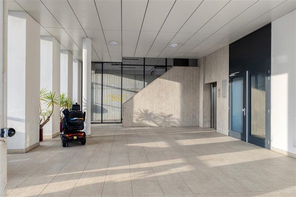 De hal voor de woning biedt ruimte voor kapstok, schoenen en kinderwagens. Stap de woning binnen en laat je verrassen door de ruimte van dit gelijkvloerse appartement. De woonkamer is ruim opgezet en baadt in het licht dankzij de grote raampartijen. Hier kun je een gezellige zithoek creëren, waar je na een lange dag ultiem kunt ontspannen met een wijds uitzicht. De moderne keuken is een droom voor iedere thuiskok. Met hoogwaardige inbouwapparatuur, veel lades en een wijnkast.