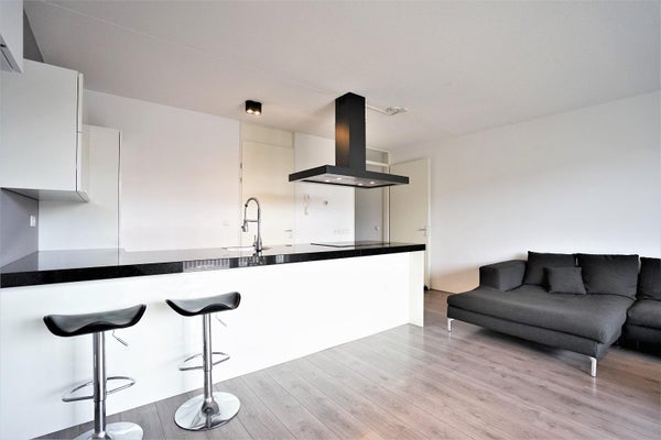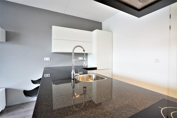 De lichte woonkamer is gelegen aan de voorzijde van het complex en beschikt over grote raampartijen en openslaande deuren naar het zonnige balkon van circa 11 m², gelegen op het zuidwesten. De luxe open keuken is modern uitgevoerd en voorzien van een schiereiland met kook- en spoelgedeelte en diverse inbouwapparatuur, waaronder een inductiekookplaat, vaatwasser, combimagnetron, afzuigkap en een koelkast met drie-ladenvriezer. Daarnaast is er volop kastruimte aanwezig.