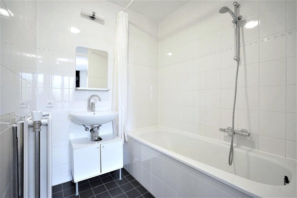 Aan de rustige achterzijde van de woning ligt de ruime slaapkamer, met een en-suite badkamer voorzien van een ligbad met douche en een wastafel.