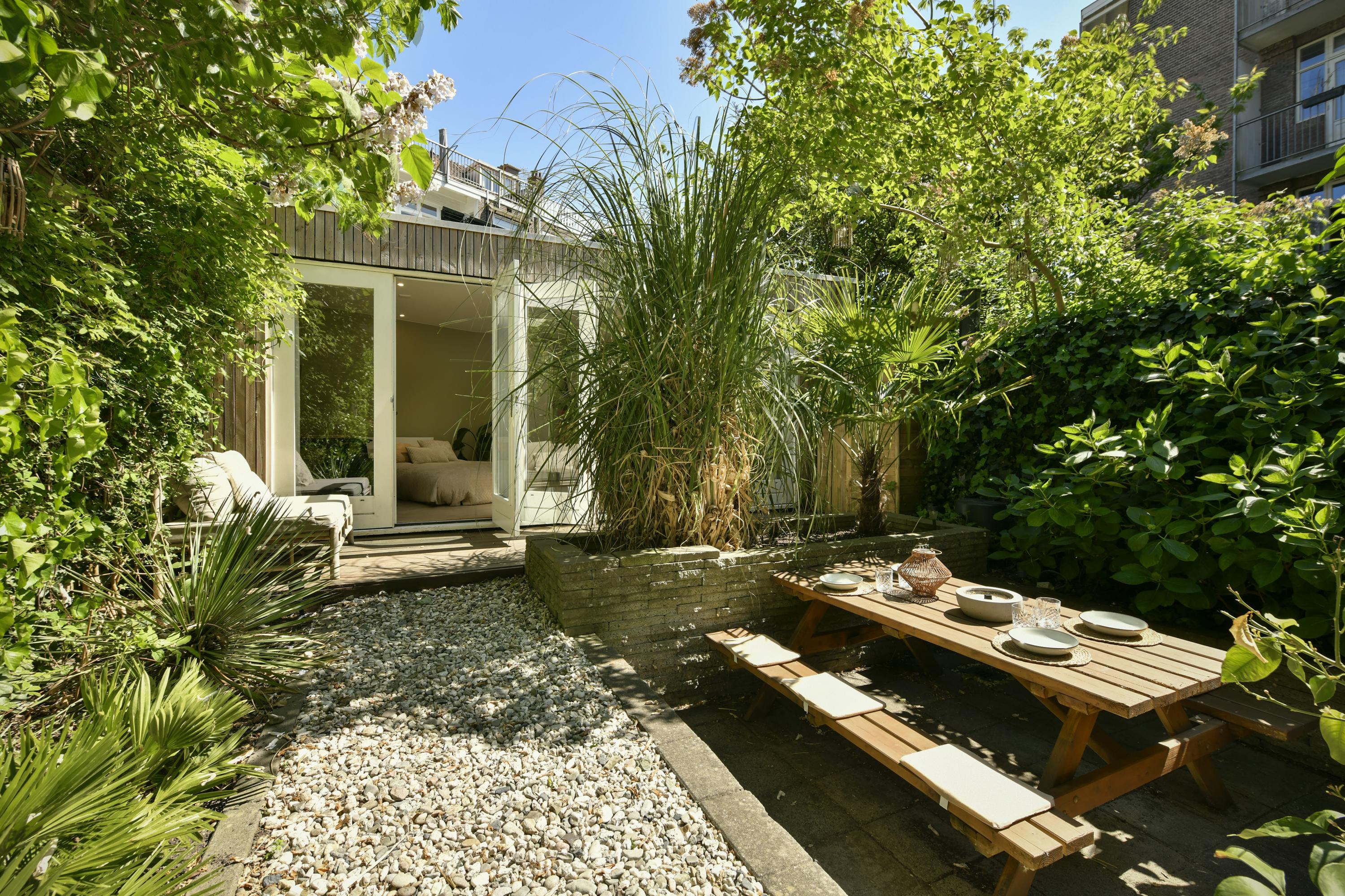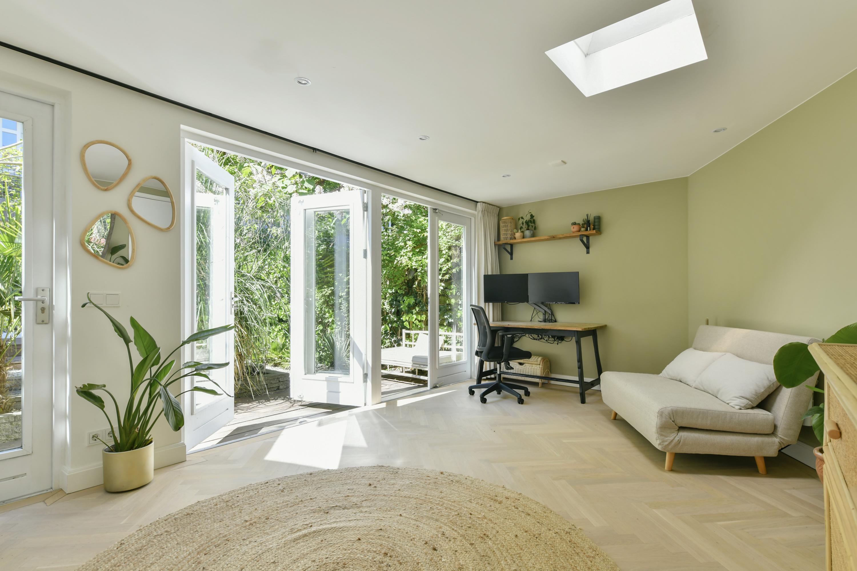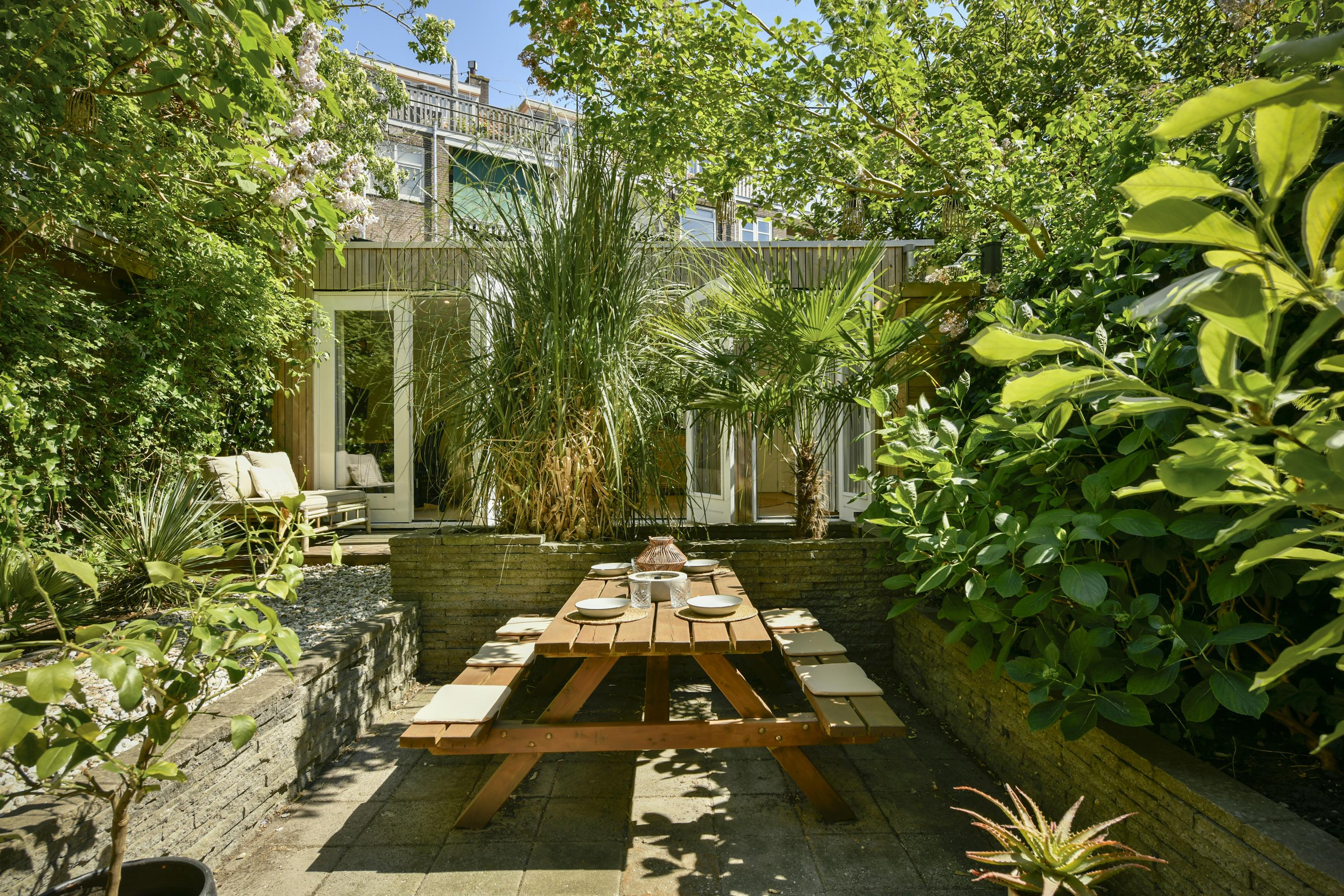 De achtertuin van 64 m², gelegen op het zuidoosten, is fraai aangelegd en beschikt over een vrijstaande schuur met verwarming, elektra en water. Betaald parkeren is beschikbaar in de omgeving.