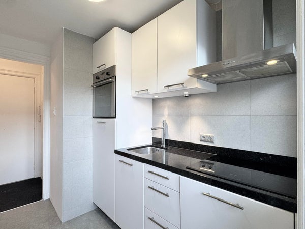 The entrance of the apartment provides access to the bathroom, which is located on the left and is fitted with a toilet and shower. Directly opposite the entrance is the kitchen, which is equipped with an induction cooktop and has access to the balcony at the rear of the building. To the right of the entrance, the spacious living room is located and benefits from a French balcony facing the city side. Adjacent to the living room is a second bedroom with a built-in closet. The main bedroom is located on the opposite side of the living room and is generously sized. This bedroom also provides direct access to the rear balcony and is situated at the quieter side of the building. The apartment is located on the second floor.