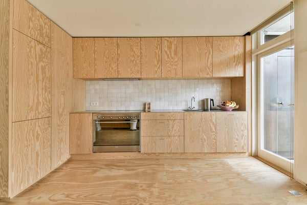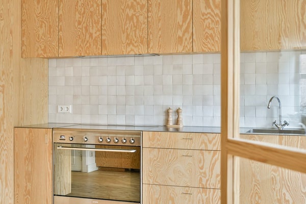 Het warme berkenhout vormt een harmonieus geheel waarin alle vaste meubels zijn mee ontworpen. Dankzij de grote open ruimte, het overvloedige daglicht en de slaapkamer met houten glaspui voelt de woning aanzienlijk ruimer dan de vierkante meters doen vermoeden en ontstaat een serene, bijna minimalistische sfeer die direct voelbaar is zodra je binnenstapt.