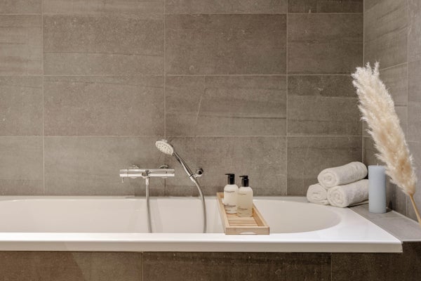 The bathroom is finished in timeless tones and features a bathtub, a modern shower, and a stylish washbasin cabinet with ample storage space. The toilet is separate, providing extra comfort and convenience. Directly next to the toilet is an internal storage room with connections for a washing machine and dryer, as well as additional storage space.
