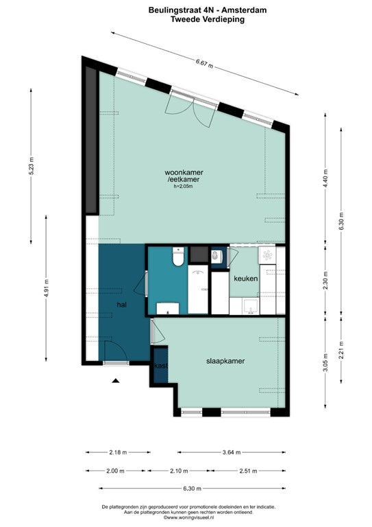 - De bovenwoning heeft een woonoppervlakte van 63 m² en beschikt over 2 kamers, waarvan 1 slaapkamer;