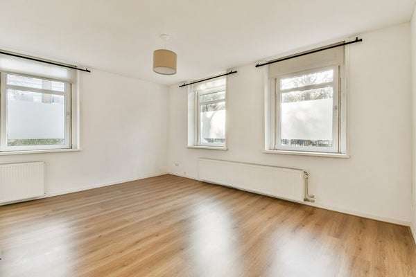 Brede en lichte woonkamer met drie grote ramen op het zuidwesten. Door de hoekligging valt hier gedurende de dag veel zonlicht binnen. De laminaat vloer geeft de kamer een warme en moderne uitstraling.